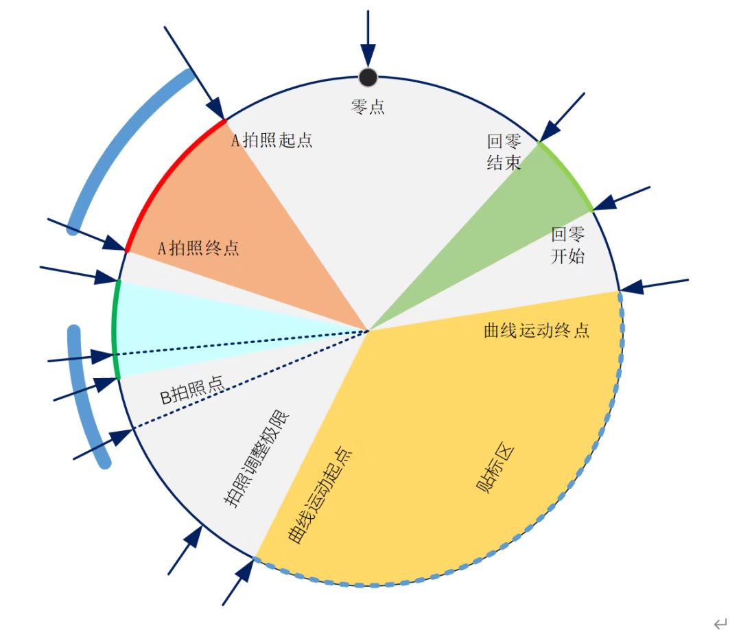 在貼標(biāo)的托盤上,瓶子會(huì)被卡到托盤的凹槽中,如果瓶子是非圓形的,那么這個(gè)托盤必須旋轉(zhuǎn)到所需貼標(biāo)面(如有些瓶子是菱形或者橢圓形),因此,需要獲得一個(gè)旋轉(zhuǎn)角度使得其剛好可以作為貼標(biāo)的起點(diǎn),而另一方面,這個(gè)托盤在進(jìn)入貼標(biāo)區(qū)域的時(shí)候,它必須與貼標(biāo)頭保持線速度的一致,然后再去回零,整個(gè)過程根據(jù)貼標(biāo)尺寸的變化,是一個(gè)電子凸輪曲線(CAM)位置環(huán)控制,這個(gè)就需要托盤高速跟隨主軸,并且隨著貼標(biāo)尺寸規(guī)格的變化可以自動(dòng)計(jì)算凸輪曲線,并獲得光滑的切換能力。圖3-則顯示了每個(gè)托盤都需要進(jìn)行的這個(gè)運(yùn)動(dòng)控制過程。