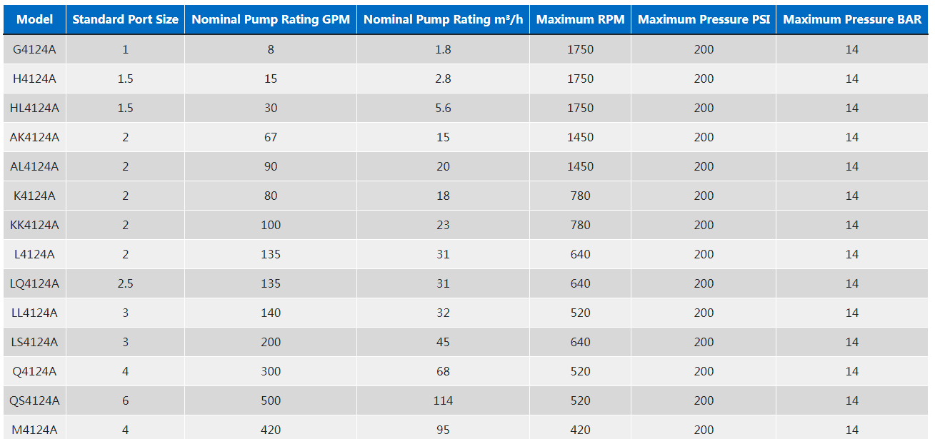 1124A系列™ 采用O-Pro®密封技術(shù)的內(nèi)部齒輪泵是粘合劑、淀粉、聚合物等的完美解決方案,因為它具有可靠的密封和易于維護。它可以處理8至400 GPM(1.8至91 m³/h)的流量。