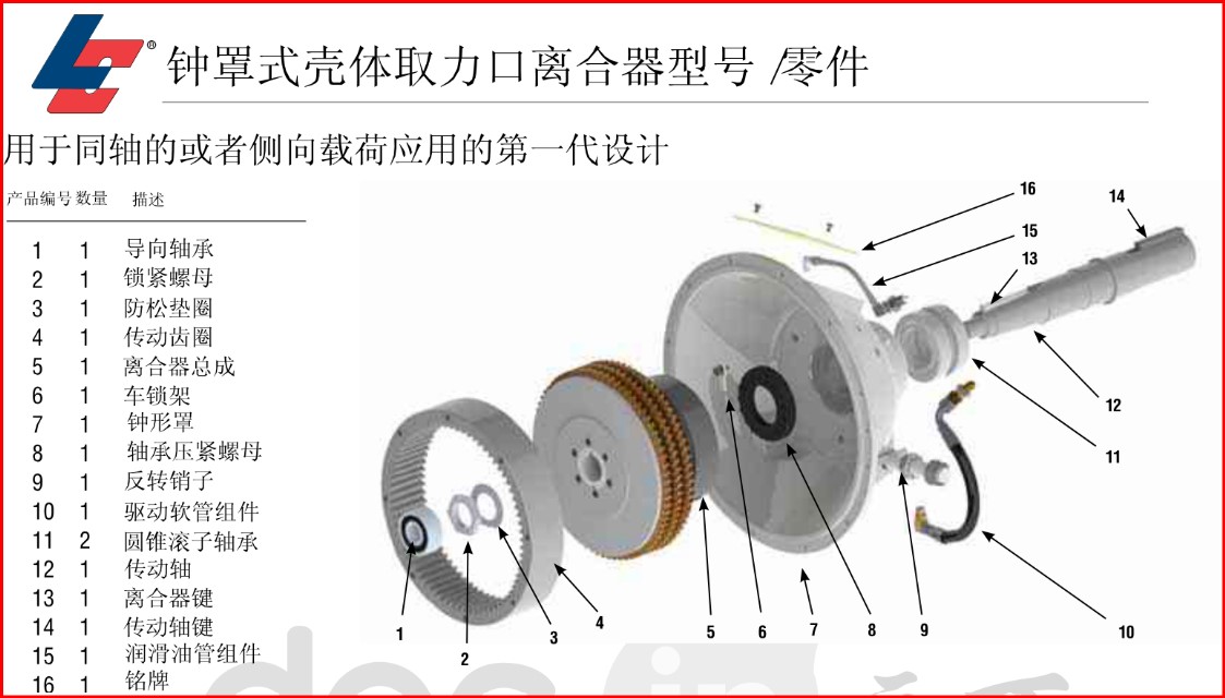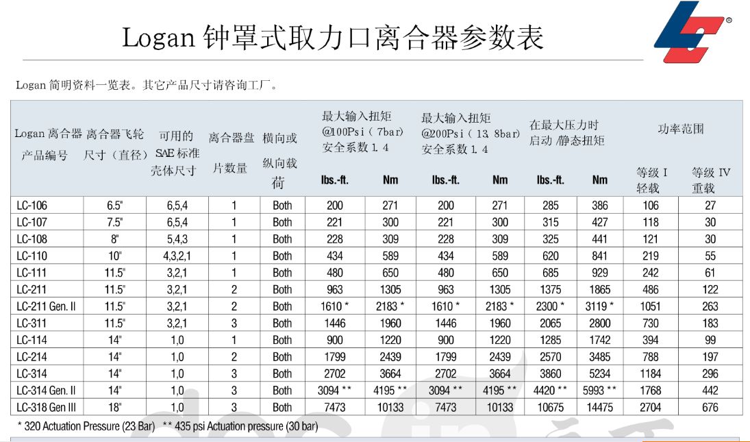 Logan氣/液驅(qū)動(dòng) 鐘罩式殼體取力口離合器式自調(diào)節(jié)的,設(shè)計(jì)成直接安裝到柴油發(fā)動(dòng)機(jī)或者汽油發(fā)動(dòng)機(jī)的飛輪上。摩擦圓盤(pán)組為干式應(yīng)用設(shè)計(jì)。通過(guò)一個(gè)固定的缸套-活塞布置或者通過(guò)內(nèi)置軸和離合器油道來(lái)完成。離合器的傳動(dòng)軸通過(guò)內(nèi)孔或鍵槽來(lái)安裝。扭矩從盤(pán)片組傳遞到安裝在發(fā)動(dòng)機(jī)飛輪上的齒輪傳動(dòng)齒圈上。Logan離合器主杠加壓, 推動(dòng)活塞夾緊或鎖住摩擦片或分離鋼片。當(dāng)壓力移走, 回位彈簧使摩擦片和鋼片分離, 當(dāng)鋼片和摩擦片分離后, 可以保持運(yùn)行間隙。